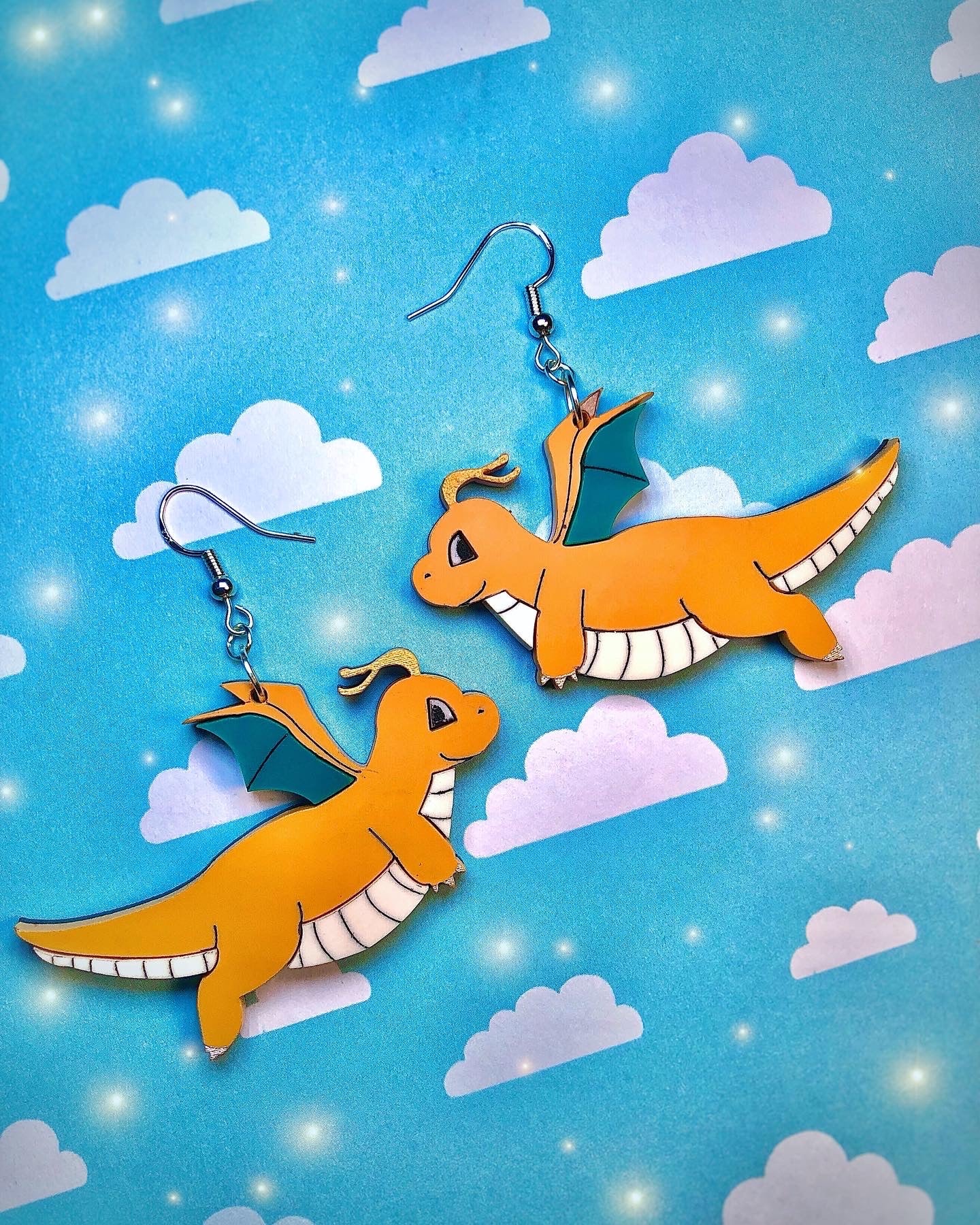 The Dragonite Earrings feature matte orange, hunter green, and nude acrylic with engraved details. The earring closure is sterling silver. All my designs are digitally created, laser cut, and then hand assembled.