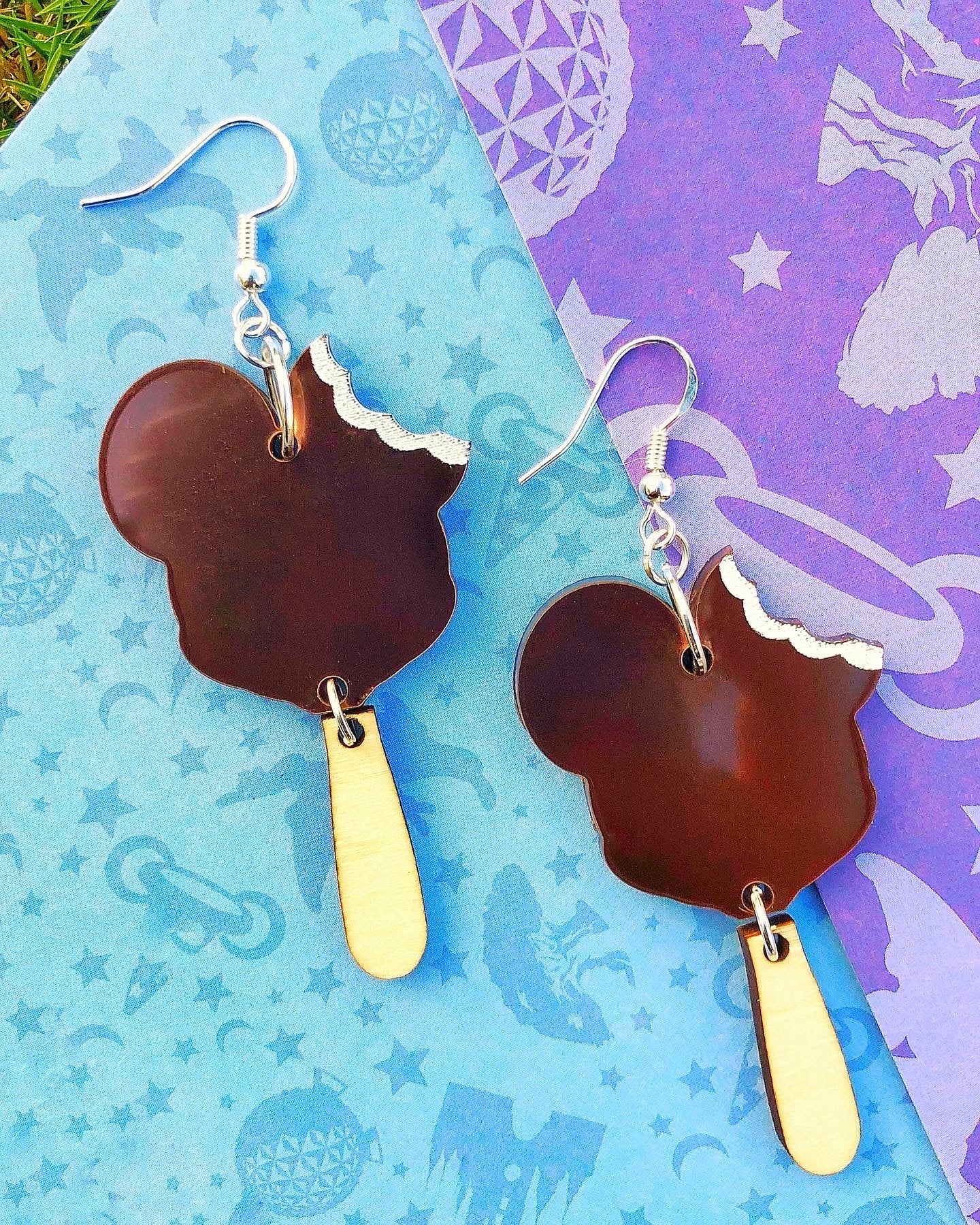 The Mouse Ice Cream Earrings Earrings feature multiple acrylic colors with engraved details. The earrings closure is sterling silver. All my designs are digitally created, laser cut, and then hand assembled.