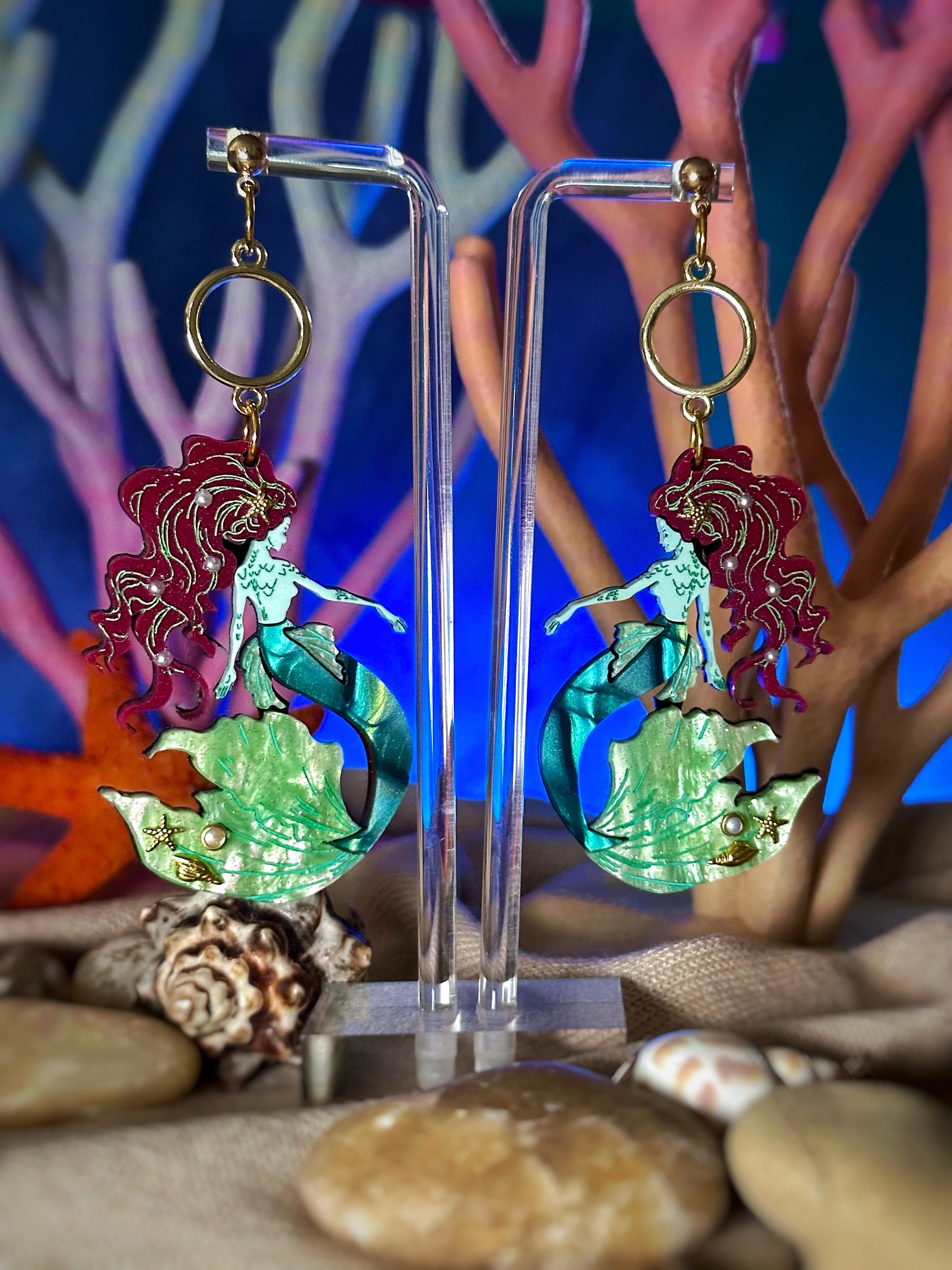 Protector of the Sea Mermaid Earrings feature a variety of acrylics. The earring closures are hypoallergenic ball posts in a gold color. All my designs are digitally created, laser cut, and then hand assembled.